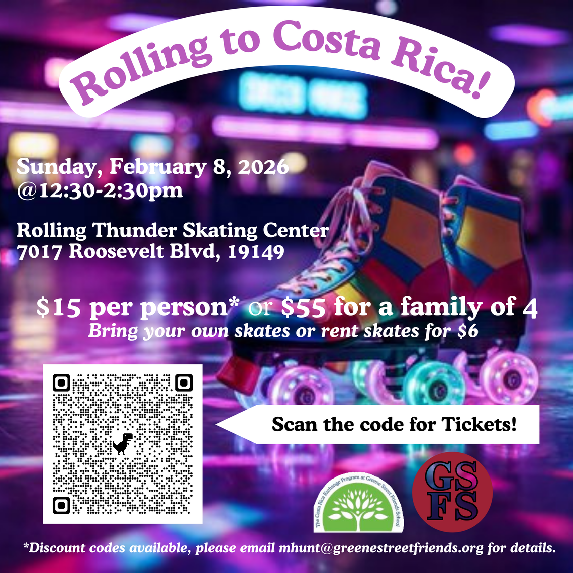 Join us for Rolling to Costa Rica, at Rolling Thunder Roller Rink (7017 Roosevelt Blvd, 19149) on Sunday, February 8, 2026 @12:30pm-2:30pm!