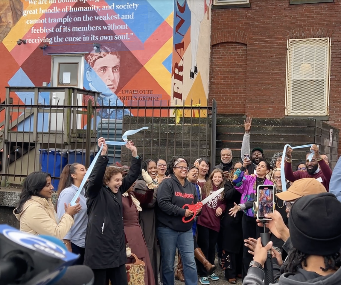 In the last stanza of her famous poem, “Bury Me in a Free Land,” Harper pleads: “I ask no monument, proud and high, To arrest the gaze of the passers-by; All that my yearning spirit craves, Is bury me not in a land of slaves.” We ask ourselves, now that she has a monument—this mural on our building— what does it mean to honor her wishes and to continue her work?: At GSFS, that means turning her story and legacy into action, and through curriculum development, through poetry workshops, through full school learnings, we are, and we plan to, to amplify her work and share throughout the region.When the rain cleared and the sun lit up the edges of the clouds and warmed the damp side walk, we went outside to witness history, as the ribbon was cut in front of the mural. Risë stood beneath a vision of her past self on the side wall with Ursula beside her. And the spirit of each of these influential Black women—both past and present—were in attendance with us, signaling that we truly are all bound up together, and forever will be.